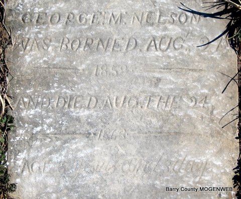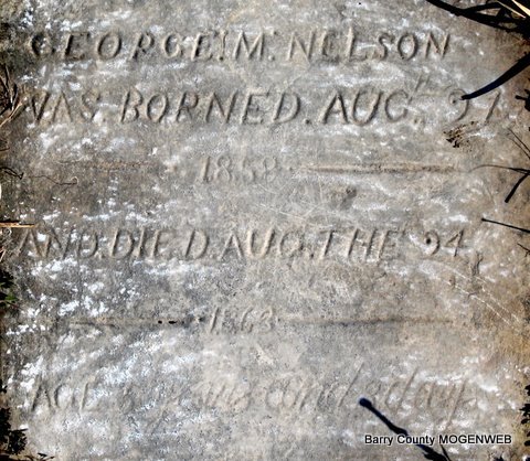 | NELSON, George M. | Aug. 21, 1858 | Aug. 24, 1863 | Inscription: "George M. Nelson was borned Aug. 21, 1858 and died Aug. 24, 1863 Age 5 years and 3 days." - Another Photo - Another Photo | Photos Jack Fly |