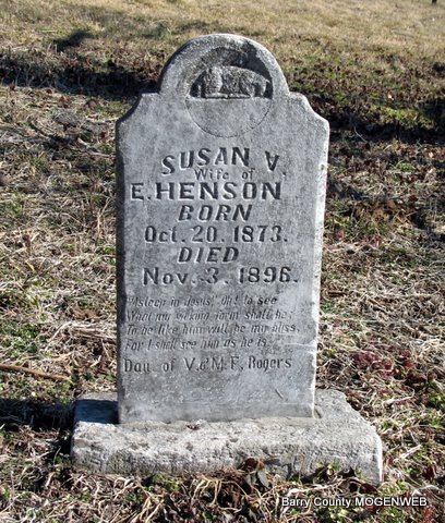 | HENSON, Susan V. | Oct. 20, 1873 | Nov. 3, 1896 | Inscription: "Wife of E. Henson" - Research Note The grave next to Susan is Thomas Yancy Henson. Not on the first transcription. | Photos Jack Fly |
