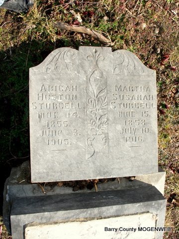 | STURGELL, Abigah Huston | May 14, 1855 | June 3, 1905 | SSW: Martha Susannah Sturgell - Research Note: Son of Isaac Sturgell and Mary Bandy. This stone is broken off from the base. - Stone off Base | Headstone Lanny and Mary Homesley Photos Jack Fly Census Phyllis Long |