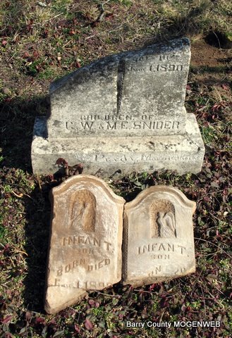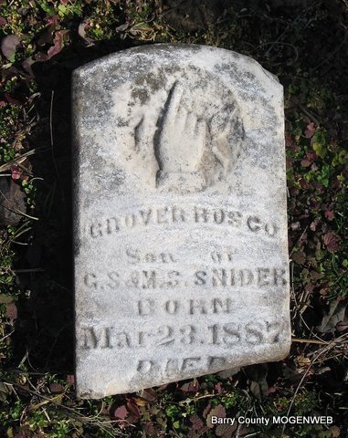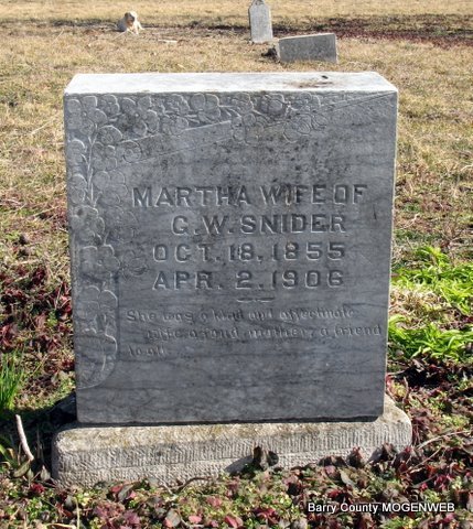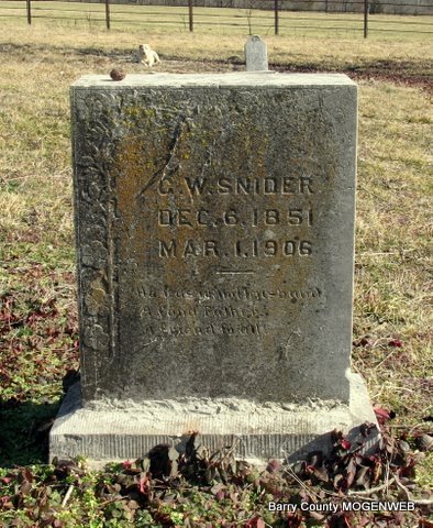 | SNIDER, George Washington | Dec. 6, 1851 | Mar. 1, 1906 | Research Note: Husband of Martha Elizabeth Brock. Son of Christopher Snider and Sarah Wilson. George Snider married Martha Brock on Apr. 7, 1872 in Barry Co., MO. | Headstone Lanny and Mary Homesley Photo Jack Fly MO Marriage Records Census Phyllis Long |