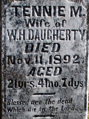 | DAUGHERTY, Tennie M. (SNIDER) | Abt. 1871 | Nov. 11, 1892 | Inscription: "21 years, 4 months, 7 days - Wife of W. H. Daugherty" - Research Note: Daughter of Christopher Snider and Sarah Wilson. Wife of William Henry Daugherty buried at Washburn Prairie Cemetery. Tennessee Snider, age 20, married William H. Daugherty, age 22, on Nov. 1, 1891 in Barry Co., MO. - Cassville Republican, Nov. 17, 1892 - Flat Creek News: Mrs. Tennie Daugherty, wife of William Daugherty, died the 11th inst. She leaves a husband and many relatives to mourn her loss. - Another Photo | Headstone Lanny and Mary Homesley Photos Jack Fly Online Newspapers Census MO Marriage Records Phyllis Long |