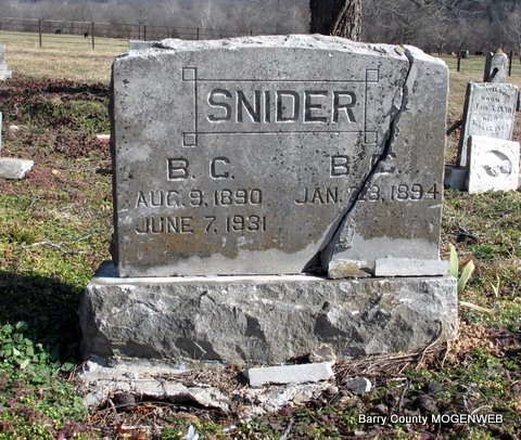 | SNIDER, "B. C." Benjamin Christopher | Aug. 9, 1890 Cato, Mineral Springs Twp., Barry Co., MO |