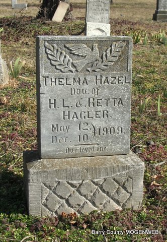 | HAGLER, Thelma Hazel | May 12, 1909 | Dec. 10, 1909 | Inscription: "Dau. of H. L. and Retta Hagler" - Research Note: Daughter of Harmon Levi Hagler and Retta Estelle Snider both buried at Mars Hill Cemetery. - Parents marriage record: January 12, 1907, Saturday, Cassville Democrat - Shell Knob News: Married at the home of the bride's parents, six miles east of here Miss Snider and Harmie Haegler of this place. They are well and favorable known and we join with their many friends in wishing them a long and prospers married life. | Headstone Lanny and Mary Homesley Photo Jack Fly Online Newspapers Phyllis Long |