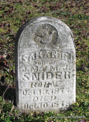| SNIDER, Sarah (WILSON) | Jan. 31, 1831 | Dec. 22, 1925 | SSW: Chris Snider - Inscription: "Mother" - Research Note: Daughter of Mary Pauline Moore and George Wilson, listed on this page. Christopher Snider married Sarah Wilson on Feb. 9, 1851 in Barry Co., MO. | Headstone Lanny and Mary Homesley Photo Jack Fly MO Marriage Records Census Phyllis Long |