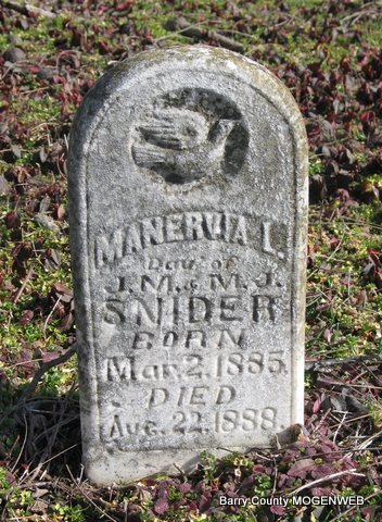 | SNIDER, Manervia L. | Mar. 2, 1885 | Aug. 22, 1888 | Inscription: "Dau. of J. M. and M. J." - Research Note: Daughter of James Madison Snider and Mary Josephine Moore. | Photo Jack Fly |