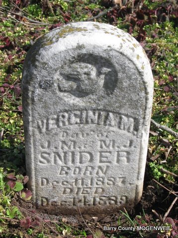 | SNIDER, Verginia M. | Dec. 11, 1887 | Dec. 14, 1889 | Inscription: "Dau. of J. M. and M. J." - Research Note: Daughter of James Madison Snider and Mary Josephine Moore. | Photo Jack Fly |
