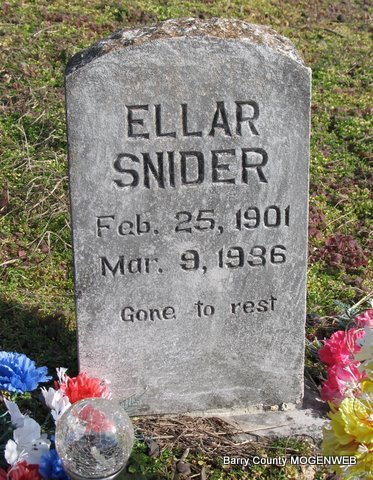 | SNIDER, Sarah Luella "Ellar" (STOCKTON) | Feb. 25, 1901 Jenkins, Barry Co., MO |