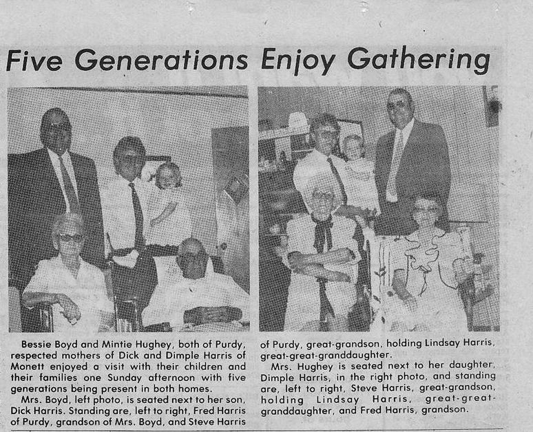 Bessie Boyd and Mintie Hughey, both of Purdy, respected mothers of Dick and Dimple Harris of Monett enjoyed a visit with their chidlren and their families one Sunday afternoon with five generations being present in both homes. Mrs. Boyd, left photo, is seated next to her son, Dick Harris, Standing are, left to right, Fred Harris of Purdy, grandson of Mrs. Boyd, and Steve Harris of Purdy, great-grandson, holding Lindsay Harris, great-great granddaughter. Mrs. Huhey is seated next to her daughter, Dimple Harris, in the right photo, and standing are, left to right, Steve Harris, great-grandson, holding Lindsay Harris, great-great granddaughter, and Fred Harris, grandson. My Mom had this clipping in a shoebox. She forgot how she got it, but thinks it may have been among one her uncle's effects. The Bessie Boyd mentioned was a daughter of James W. and Fannie M. (Fowler) McIntosh. She was born in 1894 probably in Barry Co. and probably died there in 1988 and is buried in Sparks cemetery. It must be pretty rare for the event of 5 generations alive at once to occur twice in one family at the same time. Submitted by Stan McKay - Deceased |