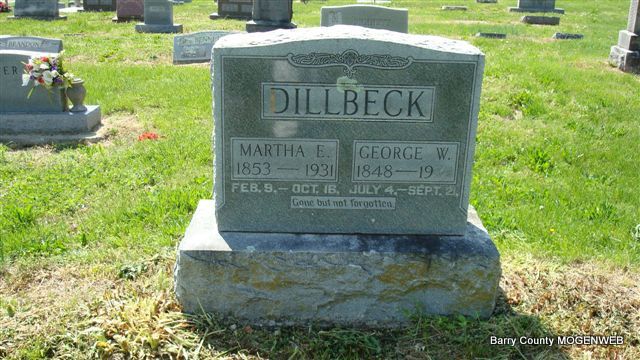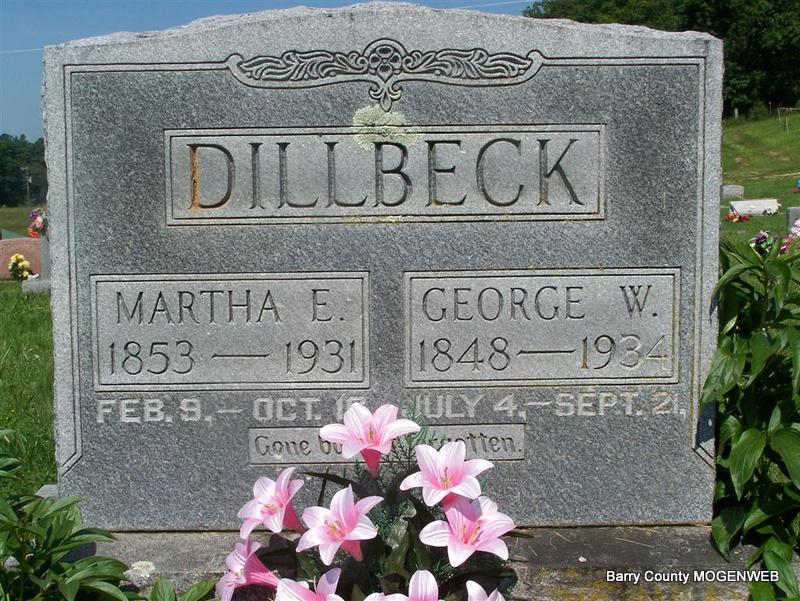 Sept. 21, 1934 | SSW: Martha Emily - Research Note: Son of William Dillbeck and Sarah Jones. - Cassville Republican, Barry Co., MO, Thursday, March 15, 1894 - George Dilbeck returned last week from Yell Co., AR, where he had traded stock for a farm. - December 29, 1917, Saturday, Cassville Democrat - Hugh Morton, George Dilbeck and wives motored to Monett, Sunday. While there Mr. Dilbeck purchased a new Ford. - Cassville Democrat, June 12, 1920 - Geo. Dilbeck and Roy Haskins of near Sparks school house, motored to this city, on the 4th. Mr. Dilbeck said Mrs. Dilbeck was able to be up on crutches from recent injuries. The recent heavy rains badly washed some of his land. Roy Haskins said the waters in Dog Hollow did great damage recently, to farm lands. - Another Photo | Photo Loretta Vinson LoVella Truhitte Moore Online Newspapers Census Phyllis Long |