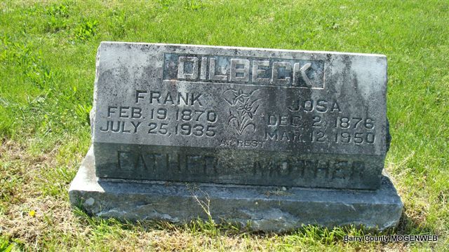 SSW: Josa - Inscription: "Father" - Research Note: Son of George Dilbeck and Martha Bandy, both born GA. Mrs. William F. Dilbeck, his wife was the informant on the death certificate. - Cassville Republican, April 13, 1893 - Circuit Court Proceedings: Artmiss "Artie" Dillbeck v. Wm F. Dilbeck, divorce, decree for pl'ff. - William F. Dilbeck, age 23, married Josia Box on July 9, 1893 in Barry Co., MO. - August 30, 1894, Thursday, Weekly Paper, Cassville Republican - Died, Tuesday, Aug. 21, Mrs. Artie Dilbeck, of tumor of the bowels. - June 10, 1915, Thursday, Cassville Republican - Cross Hollows: Frank Dilbeck and family and Mrs. Laney and son, Jerry, and others spent Sunday with Dave Mills and family. - Cassville Democrat, July 1935 - Funeral services for Frank Dilbeck, who passed away at his home on Flat Creek northeast of Cassville 5 miles, Thursday morning, July 25, 1935 from a heart attack while doing his morning chores about his place, were held Saturday afternoon, July 27, at the Merl's Chapel church on Flat Creek. The services were conducted by Rev. Winford Davis. Burial was made in the cemetery at Sparks, under direction of the Horine-Culver Funeral Service. Frank Dilbeck was a son of the late Mr. and Mrs. George Dilbeck who lived for many years in the Sparks community. He was born in Howell Co., MO (death certificate says Georgia) in 1871. The family moved to this county when Frank was a small boy and the Sparks community had continued to be his home. He was a good citizen and his sudden death come as a severe shock to the people of the community in which he had lived for so long. He was held in high esteem by all who knew him. Surviving him are his widow and eight children. The children are Mrs. Harry (Alta) Bush, Mrs. Fred (Eva) Pilant, Mrs. Vera Long, Mrs. Charles (Lela) Baker, Mrs. Gene (Ruby) Baker, Arthur Dilbeck all of Cassville: Mrs. Lona Wright, Bassett, AK, Horace of Kansas City, MO and Bert of Ft. Smith, AR. | Photo Loretta Vinson LoVella Truhitte Moore Death Certificate Online Obit MO Marriage Records Census Phyllis Long |