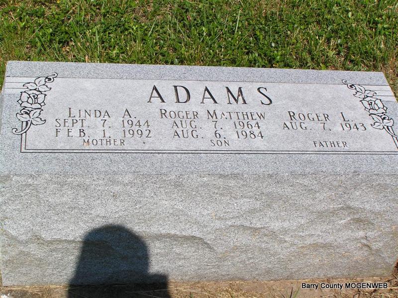 | ADAMS, Linda A. | Sept. 7, 1944 | Feb. 1, 1992 | SSW: Roger Matthew and Roger Lewis - Inscription: "Mother" | Photo Don Warner - Deceased MO Marriage Records Phyllis Long |