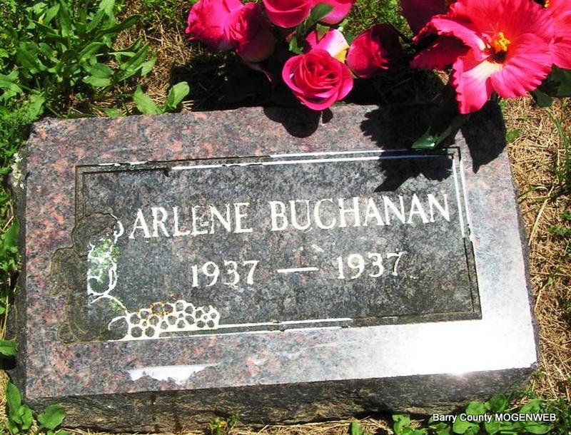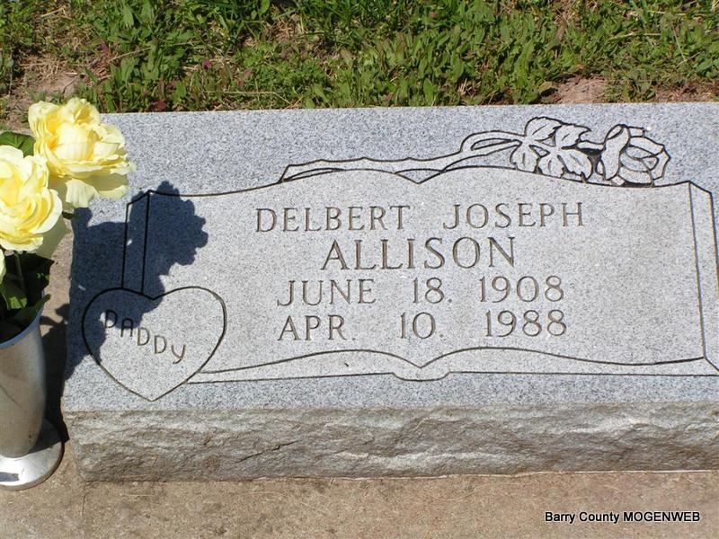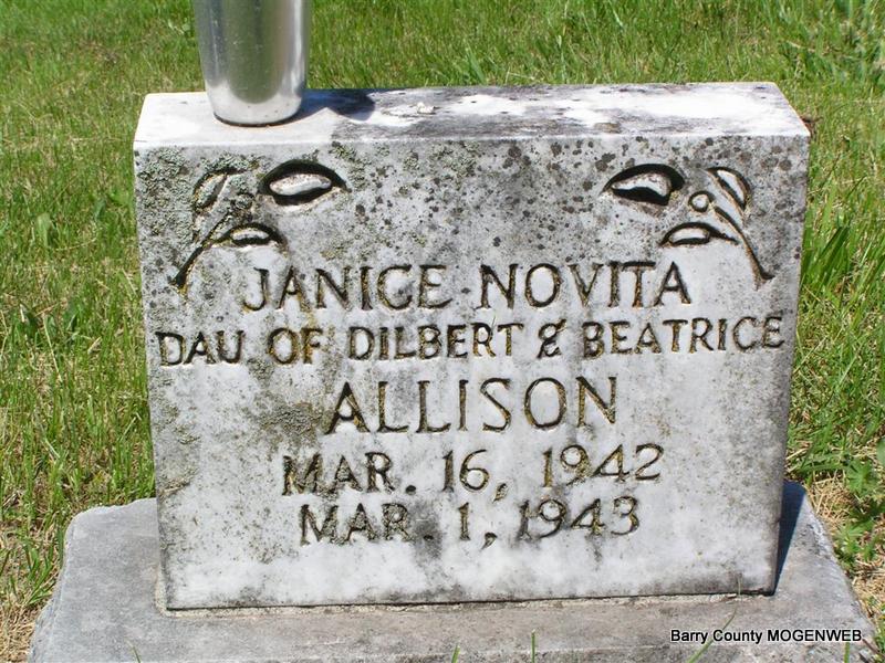Inscription: "Dau. of Delbert and Beatrice Allison" - Research Note: Her death certificate has her name spelled Alison and not Allison as the stone reads. Delbert Alison, born Barry Co., MO, and Nickle, born Barry Co., Mo, were her parents. C. F. Allison, Cassville, MO, was the informant. - Daughter of Delbert Joseph Allison and Beatrice Dorthy Nickle. | Photo Don Warner - Deceased Death Certificate Donna Cooper |