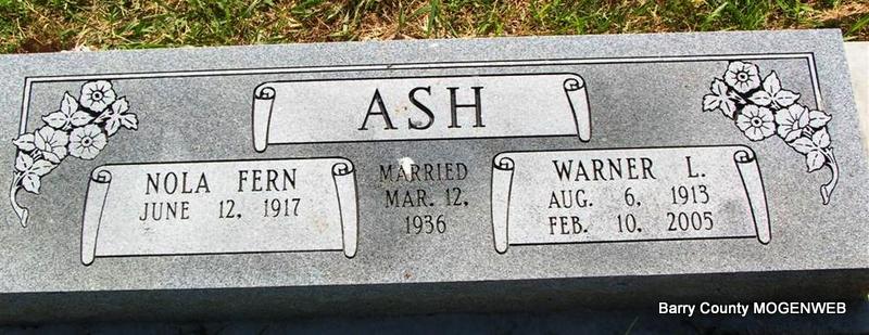 SSW: Nola Fern - Inscription: "Married March 10, 1934" - Research Note: Warner L. Ash, age 91, of Idaho Falls, Idaho, formerly of Aurora, died February 10 at his home. He was born August 6, 1913, in Hurley, and was a son of Marion Delworth and Monnie (Lee) Ash. He was a farmer and carpenter. He had attended the Church of God in Cassville and Fundamental Methodist Church in Aurora. He was married to Nola Fern Ash. He was preceded in death by five brothers, Loren, George, Hershell, Oliver, and Finis; and five sisters, Mary, Edna, Velma, Edith, and Willa Dean. | Photo Don Warner - Deceased Monett Times Feb. 16, 2005 Donna Cooper |
