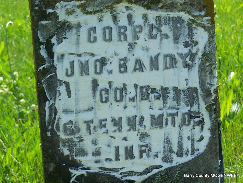 No Data | Inscription: "CORPL JNO BANDY - CO B 6 TENN MTD INF." - Research Note: He was age 37 in 1880, King's Prairie Twp., Barry Co., MO. His wife was Arrana and the children listed were George M., James H., Wilford B., Frances M. and Leander Albert. Arrana (Betterton) Bandy, is buried in Bethel Cemetery, according to her death certificate. Leander is buried in Purdy Cemetery. - Son of Jonathan P. Bandy and Hester Bolin. John P. Bandy married Aranna Betterton on May 20, 1877 in Barry Co., MO. He filed for his Civil War pension on Dec. 19, 1888 and Arrana filed for her widow's pension on Apr. 19, 1906. In the 1900 census, Arrana is widowed. | Photo Don Warner - Deceased Note Donna Cooper MO Marriage Records CW Pensions Census Phyllis Long |