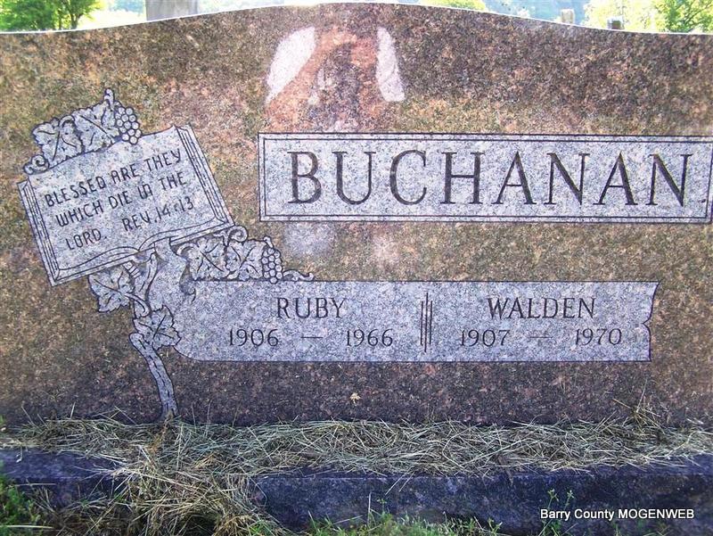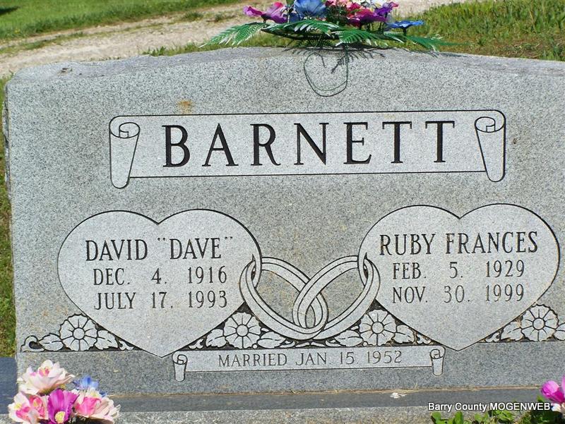 SSW: Ruby Frances - Inscription: "Married Jan. 15, 1952" - Research Note: He had lived in Joplin before moving to Butterfield 20 years ago. He was a cook at the former Sam's Motel Lodge in Joplin before retiring 20 years ago. Survived by 5 sons and 5 daughters. David Barnett first married Viola Mae "Midge" Wilson on Aug. 9, 1937 in Joplin, Jasper Co., MO. She died in 1950 and is buried at IOOF Cemetery in Monett, MO. | Photo Don Warner - Deceased Joplin Globe MO Marriage Records Phyllis Long |
