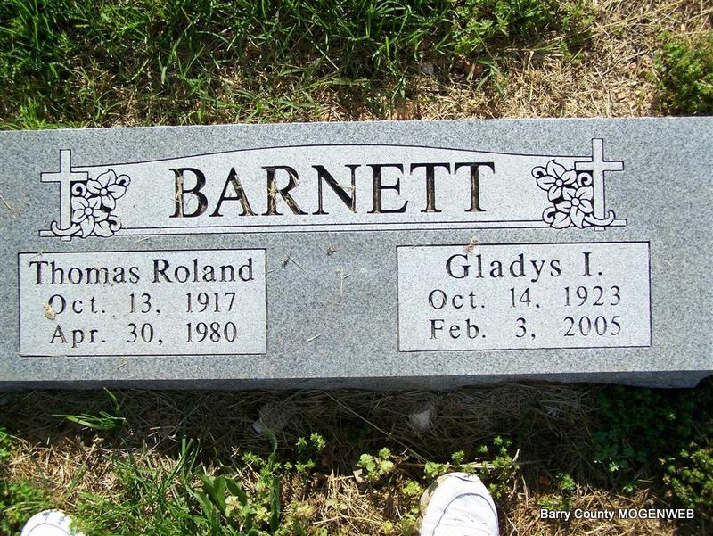 SSW: Thomas Roland - Research Note: Gladys I. Barnett, age 81, of Monett, died February 3, at Cox Monett Hospital following a long illness. She was born October 14, 1923, in Barry County, and was a daughter of Rufus and Tela (Bennett) McNeil. She was a homemaker. She married Thomas Barnett, and he preceded her in death in 1992. | Photo Don Warner - Deceased Monett Times Feb. 4, 2005 Donna Cooper |