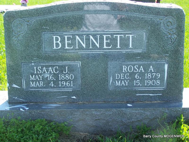 SSW: Isaac J. - Research Note: Daughter of George Washington Dilbeck and Martha Emily Bandy. Rosa A. Dilbeck, age 23, married Isaac J. Bennett, age 24, on Dec. 9, 1902 in Cassville, Barry Co., MO. - Another Photo - Another Photo | Photos Don Warner - Deceased Census MO Marriage Records Phyllis Long |