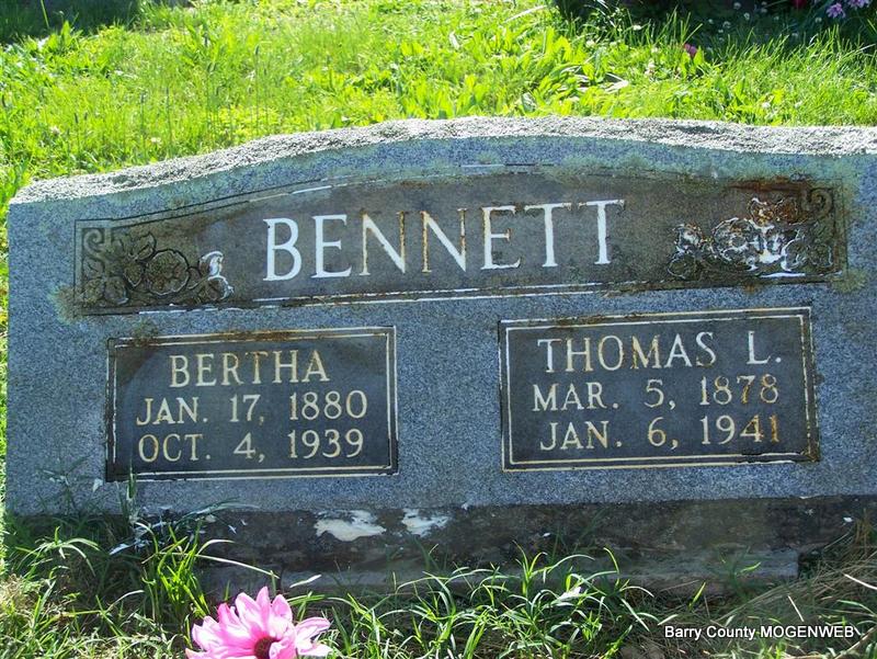 SSW: Bertha - Research Note: His death certificate reads that his father was George Washington Bennett, born KY, and his mother was Elizabeth Pauline Nichols, born KY. He was a carpenter. Ralph Bennett (son), Cassville, MO, was the informant. - Aug. 3, 1916, Thursday, Cassville Republican - Victory: Tom Bennett from Jasper attended the camp meeting at the Log church and is now visiting relatives in this vicinity. - Cassville Republican, Nov. 9, 1939 - Mrs. Martin Brandon called on her father, T. L. Bennett of Cassville Tuesday. | Photo Don Warner - Deceased Death Certificate Donna Cooper Online Newspapers Census Phyllis Long |