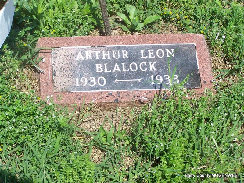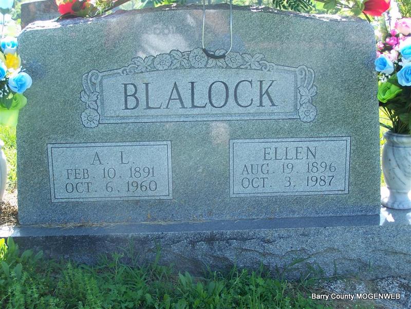 SSW: Mary Ellen - Research Note: Culver Funeral Home records have recorded that his father was Milton Blalock and his mother Mary Whitaker which is correct. The death certificate has son of Joseph Blalock and Mary Whitehead which is incorrect. Mr. Leadbetter of Raytown, MO was the informant. The cause of death was septicemia. He was separated and his wife was given as Mary Ellen Blalock and she was the informant on the death certificate. - PENNY BLALOCK RITES HELD LAST SUNDAY - Funeral services for A. L. Blalock, 69 years old, Cassville resident who died Thursday, October 6, 1960, were held at 2 o'clock Sunday afternoon in Merle's chapel. The Rev. Bill Westen, the Rev. O. T. Allred and the Rev. Fred Cunningham officiated. Burial was in Sparks cemetery under direction of Culver funeral home. Born February 10, 1891, in Stevensville, Tex., Mr. Blalock lived in the Cassville area 35 years. He was a retired farmer. Surviving are his widow, three daughters, two sons, ones sister, three brothers. - PENNY BLALOCK RITES HELD LAST SUNDAY - Funeral services were conducted Sunday, October 8, in Merle's Chapel Church for Arthur Leland "Penny" Blalock, who died October 6 in Baptist Memorial Hospital in Kansas City. The son of Milton and Mary Blalock, he was born at Stephensville, Texas, February 10, 1891. He was united in marriage to Mary Ellen Gassaway on December 24, 1914, and they were the parents of six children. One son, Leon, died in 1933. A member of the Merl's Chapel church he served faithfully as song leader and deacon for a number of years. Surviving are his wife and three daughters and two sons, one sister, three brothers. | Photo Don Warner - Deceased Culver's Funeral Home, V. 9, P. 56 By Ted Roller Online Obit Donna Cooper Death Certificate Census Phyllis Long |