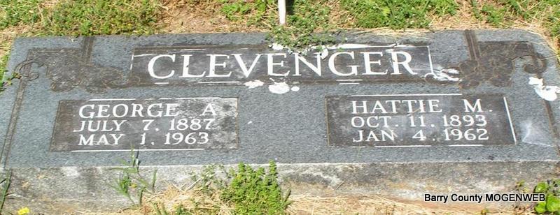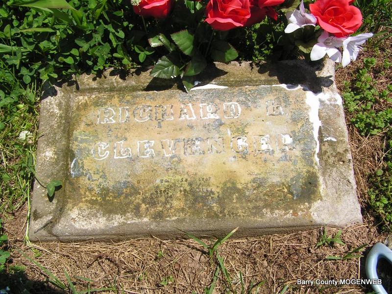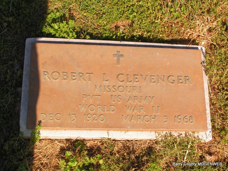 | CLEVENGER, Robert L. | Dec. 13, 1920 | Mar. 3, 1968 | Inscription: "MISSOURI PVT US ARMY WORLD WAR II" - Research Note: Son of George Albert Clevenger and Hattie McCullough. His wife was Margaret Elizabeth Martin. | Photo Don Warner - Deceased Margaret's Obit Census Phyllis Long |