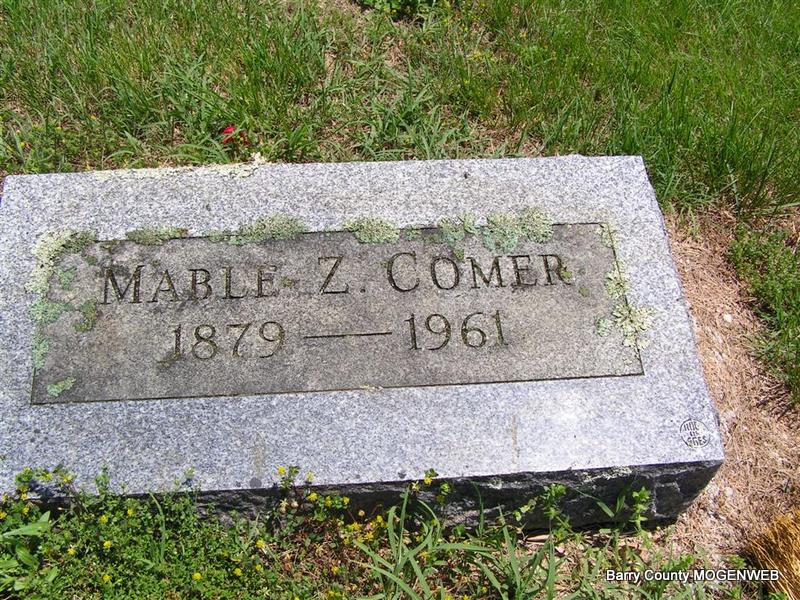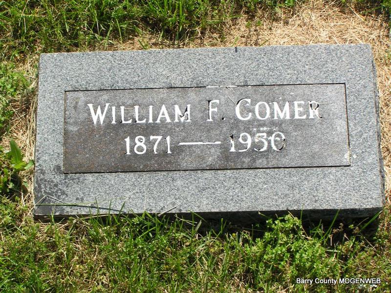 Research Note: His death certificate reads that his father was Franklin Warren Comer and his mother was named Sarah E. Foster. He was a retired farmer. Mable Comer was his wife and she was the informant. Her address was Butterfield, MO. His first wife was Lulu Alice Clegg, married on Apr. 6, 1898 in Sedalia, Pettis Co., MO. Second married Mable Z. Case on Feb. 22, 1913 in Springdale, Washington Co., AR.. - Joplin Globe - W. F. COMER FUNERAL AT BUTTERFIELD TODAY - Cassville, Mo., Jan. 23. - Funeral services for William Franklin Comer, 81 years old, who died at 8:30 o'clock yesterday morning at the family residence in Butterfield community, will be held at 2 o'clock Tuesday afternoon at the Butterfield Baptist Church. The Rev. Charles Mauk will officiate. Burial will be in Sparks Cemetery under direction of the Koon Funeral Home. Surviving are his widow, Mrs. Mabel Comer; five sons, Keith Comer of Platte City, Kan., Bruce Comer of Bartlesville, Okla., Ray Comer of Bernardsville, NJ, Virgil Comer of St. Louis, and Roy Comer of Columbus, Kan.; a daughter, Miss Maxine Comer of Kansas City; a stepson, Carl Darst of Blairstown, NJ; three stepdaughters, Mrs. Dimple Boyd of Purdy, Mrs. Jessie Simpson of Webb City and Mrs. Mildred Robinson of Kansas; eight grandchildren, two great grandchildren; 12 step-grandchildren, and one step-great-grandchild. | Photo Don Warner - Deceased Death Certificate Donna Cooper MO Marriage Records AR Marriage Index Phyllis Long |