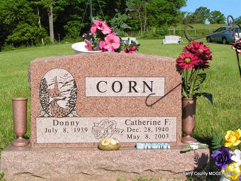 SSW: Donny - Inscription: "Nov. 28, 1959" - Research Note: Daughter of Joe and Elsie (Jaszenbeck) Golkoski - Donna's Note: Kathryn E. Corn, age 61, of Monett, died at 7 p.m. yesterday, May 8, at Cox Monett Hospital. She was born December 28, 1941, in Purdy, and was a daughter of Joe and Elsie (Jaszenbeck) Golkoski. She worked at a shoe factory and at EFCO Corporation in Monett for many years and was a member of a Catholic church. She married Donny Corn on November 29, 1959, in Wheaton, MO. Donna's Note: The paper reads she was born 1941 and the stone reads 1940. Mary posted her name spelled Kathryn E., which is what the paper reads - stone reads Catherine F. | Monett Times May 9, 2003 Mary Homesley Monett Times May 9, 2003 Donna Cooper Photo Don Warner - Deceased |