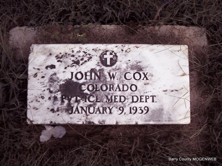 Inscription: "COLORADO PVT. ICL MED. DEPT." - Research Note: Son of Thomas Jefferson Cox and Mary Melvina Price. May have first married Grace Scroggins on Aug. 1, 1909 in Barry Co., MO. - 1910 Census, Elk Horn, McDonald Co., MO - John is age 22, divorced and living at home with parents Thomas V. and Mary Cox. - Ralph E. Duke of Cassville, MO ordered his military stone. Married to Bertha in the 1930 census. She was Bertha (Wierman) (Cox) Writer buried in Sparks Cemetery. | Photo Donna Mills Headstone Applications AR Death Index Census Phyllis Long |