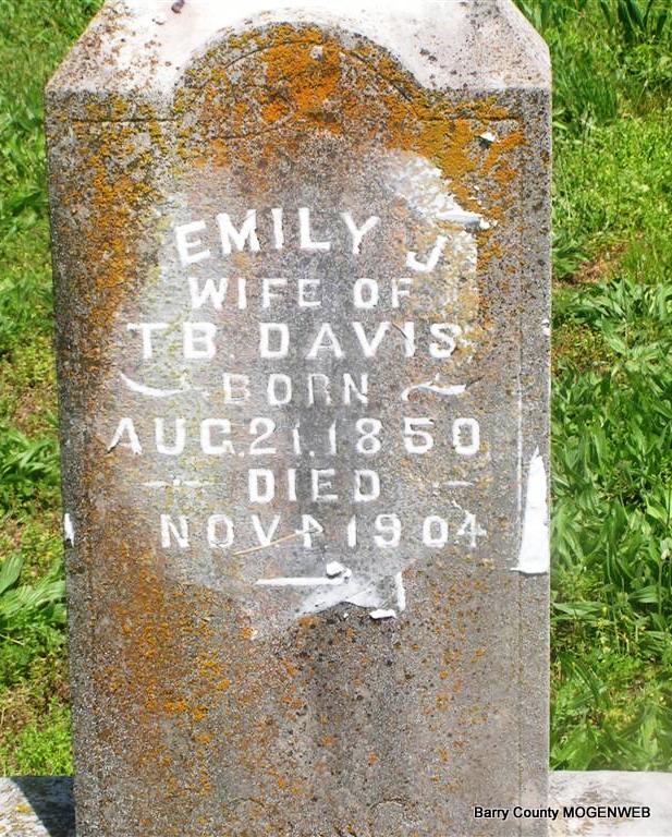 Nov. 1, 1904 | Inscription: "Emily J., Wife of T. B. Davis" - Research Note: Daughter of Aaron P. Terrell and Sarah Emily Pennington. Emily Terrell married Thomas Baldwin Davis on Sept. 22, 1872 in Lawrence Co., MO. | Photo Don Warner - Deceased Census MO Marriage Records Phyllis Long |