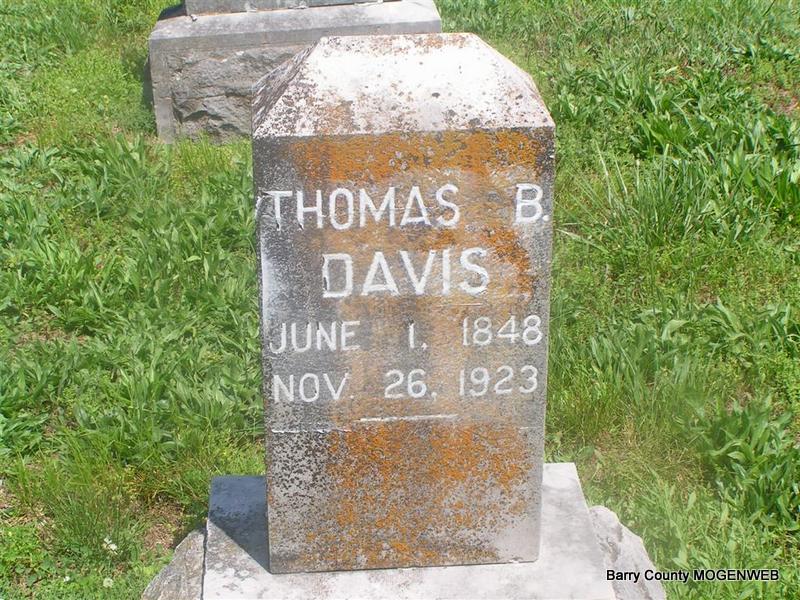 Nov. 26, 1923 | Research Note: His death certificate lists that his wife was Emily Davis but does not list his parents names. He was widowed. J. W. Riddle, Cassville, MO, was the informant. Son of Harden Houston Davis and Nancy Baldwin. Early Members of the Reorganized Church of Jesus Christ of Latter Day Saints - Thomas B. Davis was baptized a member of the Reorganized Church of Jesus Christ of Latter Day Saints on 28 September 1892 at Cassville, Barry, Missouri, by G. E. Deuel. - September 26, 1912, Thursday, Cassville Republican - Oak Ridge News: James Nickle and wife of Seneca were visiting the latter's father, T. B. Davis, last week. - October 26, 1911, Thursday, Cassville Republican - Oak Ridge News: T. B. Davis took Homer Boyer and Homer Davis to the Rock Creek hills Sunday where they will cut logs for the Earl Shore saw mill and hunt game. - November 11, 1915, Thursday, Cassville Republican - Personal and Local News: Omer Davis came in Wednesday from Idaho and is visiting his father, T. B. Davis, northeast to Cassville. - November 26, 1914, Thursday, Cassville Republican - T. B. Davis, north of town, went to Webb City, Tuesday to spend a few months with his son, Ezra. | Photo Don Warner - Deceased Death Certificate Donna Cooper Online Newspapers Phyllis Long Census Mormon Records Phyllis Long |