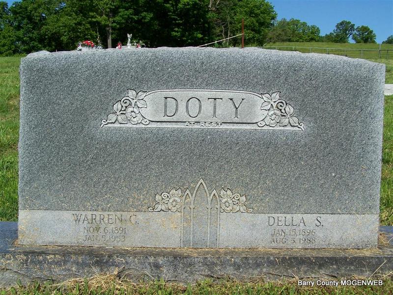 SSW: Della S. - Research Note: Son of Davis Doty and Martha Baxter. His wife, Della, was the informant on the death certificate. - Cassville Republican, Thursday, January 2, 1919 - John Long and family of near Cassville were visiting at Warren Doty's Wednesday night and Thursday. - August 7, 1920, Cassville Democrat - Harrison Doty, John Long and Warren Doty are going to Monett to work for the Frisco. | Photo Don Warner - Deceased Death Certificate Online Newspapers Phyllis Long |