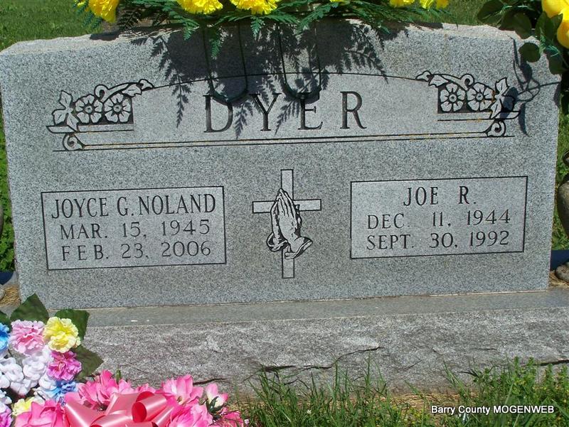SSW: Joe Russell - Research Note: On her stone her name is Dyer, but on the obit it is Noland. It reads: Joyce Gail Bennett Dyer Noland, 60, of Cassville, died February 23, 2006, at St. Louis University Hospital following a brief illness. She was born March 15, 1945, in McDowell, the daughter of Ralph Cecil and Mary (Ash) Bennett. She married Joe Dyer on November 23, 1968, and he preceded her in death. She married Robert Noland on January 22, 1993. | Photo Don Warner - Deceased Monett Times Feb. 27, 2006 Donna Cooper Obituary Jackie Slutter |