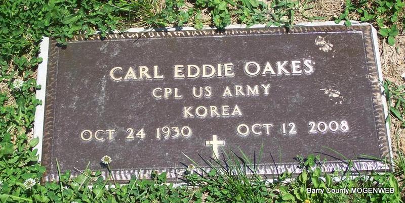 Inscription: "CPL US ARMY KOREA" - Research Note: Carl Eddie Oakes, age 77, of Butterfield, died Oct. 12, 2008, at St. John's Regional Health Center in Springfield. He was born Oct. 24, 1930, in Purdy, the son of Ramey and Flossie (Logan) Oakes. He was retired from Tyson Foods in Monett. He served in the U.S. Army from 1952 until 1954. He is survived by one sister, Mildred Halstenberg, of Pierce City. He was preceded in death by two brothers, Jim and Verdane Oakes. | Photo Don Warner - Deceased Cassville Democrat Oct. 23, 2008 Donna Cooper |