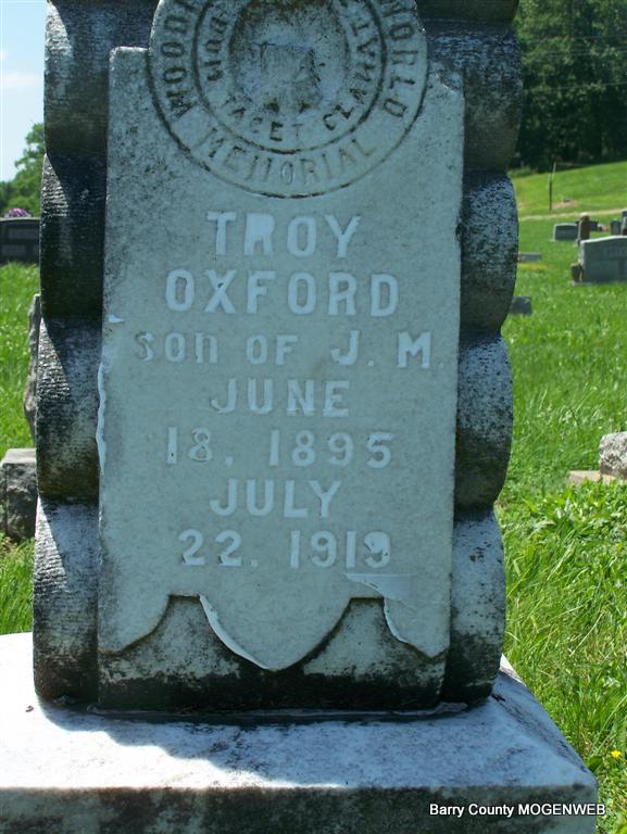 | OXFORD, Troy | June 18, 1895 | July 22, 1919 | Inscription: "Son of J. M." - Research Note: Woodmen of the World Monument. Son of Jacob Morgan Oxford and Columbia Susan Vaught. His wife was Millie Jane (Oxford) Collier. Millie second married Hilery Lee Collier. Millie was the daughter of William Washington Oxford and Margaret Cansada Downs. - Aug. 24, 1916, Thursday, Cassville Republican - Licenses to Wed: Troy Oxford, Viola and Jane Oxford, Monett. - Another Photo | Photo Donna Mills Online Newspapers Census Phyllis Long |