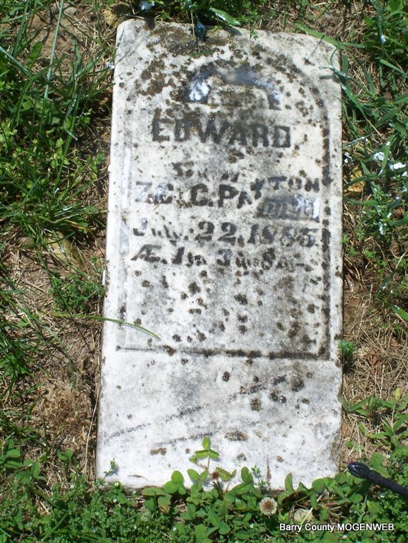 | PATTON, Edward | 1884 | June 22, 1885 | Inscription: "Son of Z. C. and C. Patton - Age 1 Yr 3 Ms 8 Ds" - Research Note: This stone is flat on the ground and nearly beyond reading. Son of Zadoc Casey Patton and Catherine Cates. | Photo Don Warner - Deceased Note Phyllis Long |