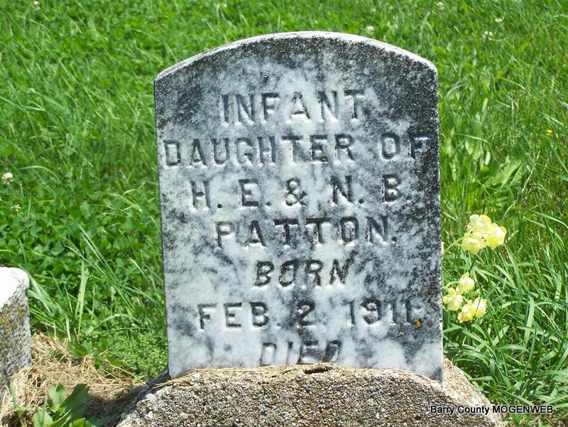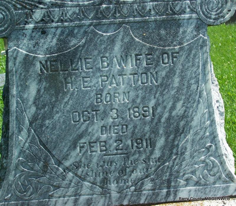 | PATTON, Nellie Belle (THOMAS) | Oct. 3, 1891 | Feb. 2, 1911 | Inscription: "Wife of H. E. Patton" - Research Note: Wife of Harrison Earl Patton. Daughter of Silas Mark Thomas and Laura Belle Ervin. Nellie Thomas, age 17, married Earl Patton on Sept. 19, 1909 in Barry Co., MO. Silas Thomas, father of Nellie, gave consent. | Photo Don Warner - Deceased Census MO Marriage Records Phyllis Long |