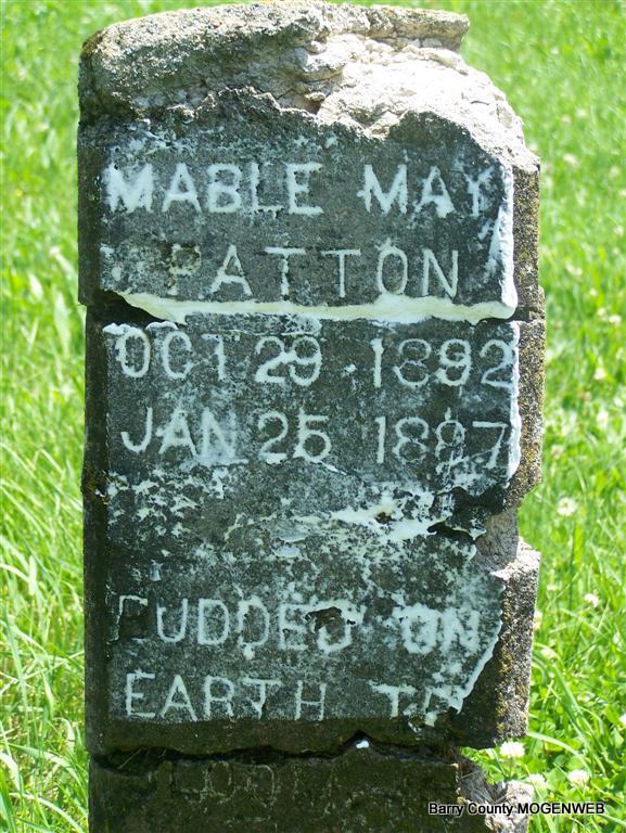 | PATTON, Mabel May | Oct. 29, 1892 | Jan. 25, 1897 | Research Note: This stone is broken at the top and in very bad shape. | Photo Don Warner - Deceased |
