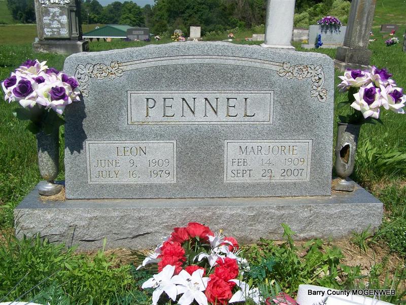 SSW: Marjorie Deloris - Research Note: Son of James Homer Pennel and Effie Pearl Smith. - Online Obit: - Butterfield, Mo. -- Leon Pennel, 70, Butterfield, died at 8:45 am Monday at South Barry County Hospital, Cassville, after an extended illness. Mr. Pennel was born June 9, 1909, in Purdy and was a lifetime resident of the Butterfield area. He was a member of the Methodist Church and was a retired self-employed carpenter. He married Marjorie Catron on March 31, 1929, in Purdy. She survives. Other survivors include a daughter, a brother, a sister, three grandchildren and six great grandchildren. Services will be at 2 pm Wednesday at Gunther Methodist Church, east of Butterfield, with Rev. Jerry Hickle officiating. Burial will be in Sparks Cemetery, east of Butterfield, under the direction of Williamson Chapel, Cassville. | Photo Don Warner - Deceased Online Obit WW II Draft Cards Census Phyllis Long |