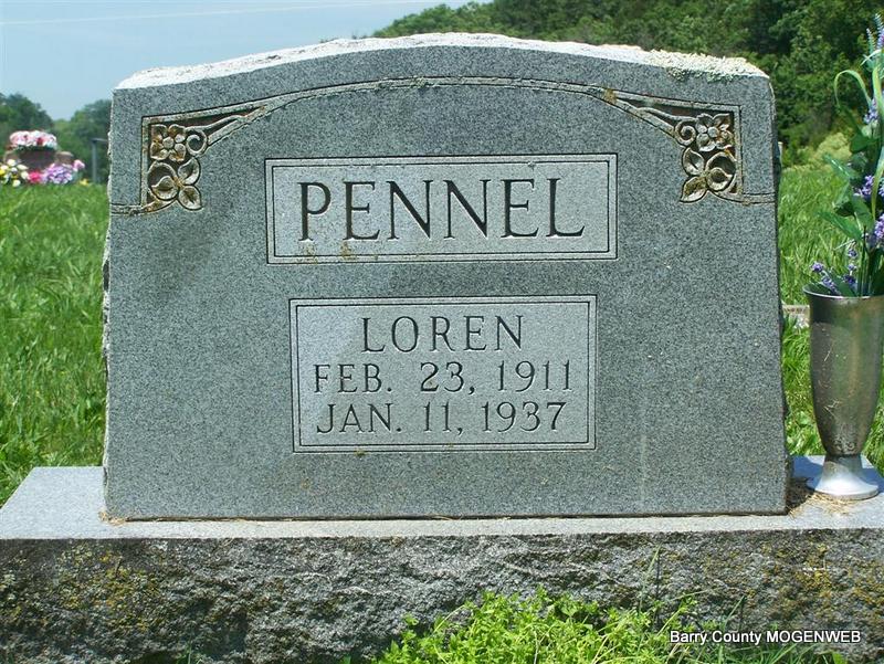 Research Note: His death certificate has that he died Jan. 12, 1937 and not Jan. 11, 1937 as the stone reads. His wife was named Frances and he was a farmer. James Homer Pennel was his father, born Barry Co., MO, and his mother was Pearl Effie Smith born Barry Co., MO. The informant was Frances Pennel, Cassville, MO, and burial was Jan. 13, 1937. - Frances Ash Catron married Loren J. Pennel on Dec. 25, 1929 in Barry Co., MO. | Photo Don Warner - Deceased Death Certificate Donna Cooper MO Marriage Records Phyllis Long |