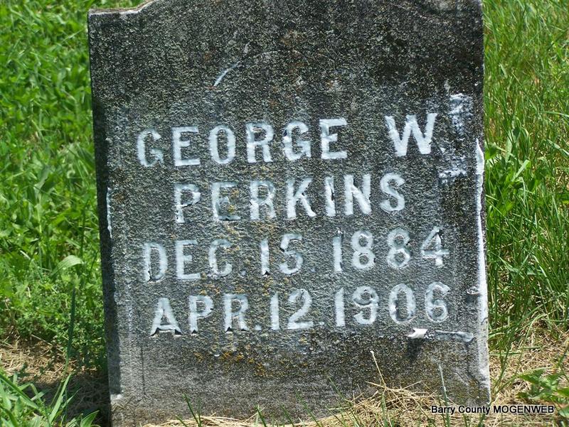 Research Note: Son of David M. Perkins and Jemima Anna Reynolds. George W. Perkins, age 18, married Maude Long, age 15, on Nov. 16, 1902 in Barry Co., MO. John Dake Long, father of Maude, and David M. Perkins, father of George, gave consent. - April 21, 1906, Cassville Democrat, Saturday - George Perkins living north of town, died on the 12th, of typhoid fever. He left a wife and one child to mourn his death. Interment was made in Sparks Cemetery on the 13th. | Online Newspapers Census MO Marriage Records Phyllis Long Photo Don Warner - Deceased |