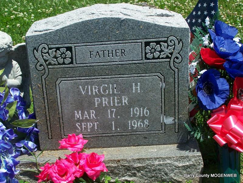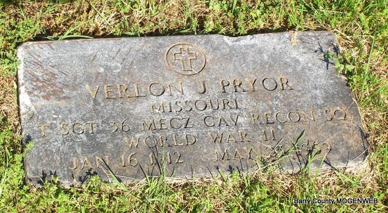 May, 23, 1959 | SSW: Nadine - Research Note: Son of William Francis Pryor and Loella Koch. Verlon J. Pryor first married Ruby Porter on June 7, 1941 in Neosho, Newton Co., MO. - Military Stone - Inscription: "MISSOURI T SGT 36 MECZ CAV. RECON SQ WORLD WAR II" | Photos Don Warner - Deceased Census MO Marriage Records Phyllis Long |