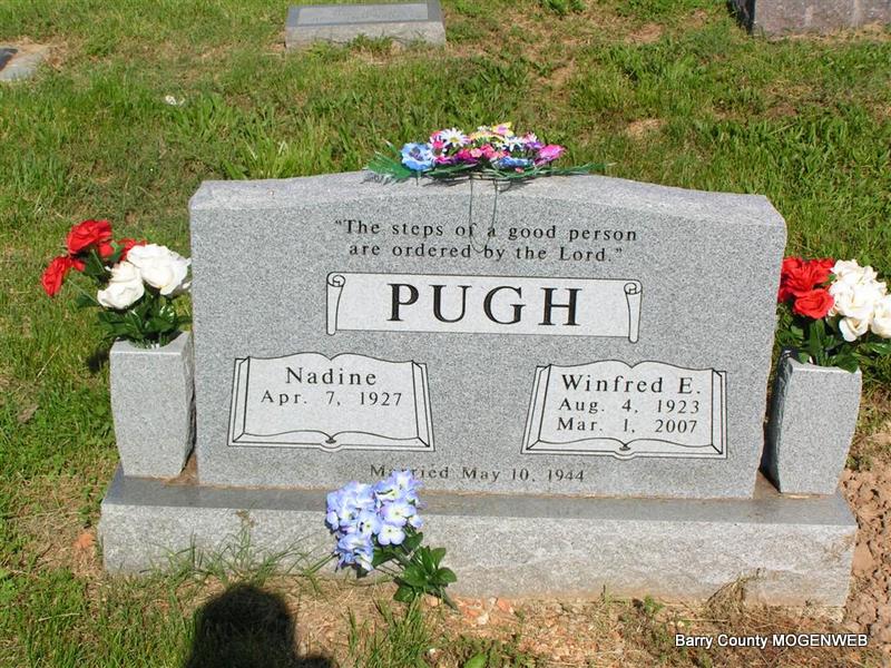SSW: Nadine - Research Note: Winfred Eugene Pugh, 83, passed away Thursday, March 1, 2007, in St. Peters. He was born on Aug. 4, 1923, to William Arthur Pugh and Bertha (Pryor) Pugh in Jasper County. At a young age he moved to Barry County along with his parents. On May 10, 1944, Winfred married Nadine Weber, a marriage that would continue for nearly 63 years. To this union four sons were born. Throughout his life of Christian service he, with his wife serving by his side, pastored churches in Missouri, Iowa, Kansas, Mississippi and Arkansas. He was preceded in death by his parents Arthur and Bertha Pugh, a brother Virgil Pugh, one grandson, and two daughters-in-law, Derry Pugh and Paula Pugh. funeral services were Monday, in Fohn Funeral Home, Cassville. Garald Pugh, Leroy Pugh, Steve Dillon and Jack Smith conducted the services. Burial was at Sparks Cemetery, Butterfield. | Photo Don Warner - Deceased Cassville Democrat Mar. 9, 2007 Donna Cooper |
