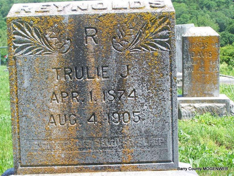 | REYNOLDS, Trulie J. (DAVIS) | Apr. 1, 1874 | Aug. 4, 1905 | Research Note: Trulie was the daughter of Thomas Baldwin Davis and Emily Jane Terrell both buried at Sparks Cemetery. She was married Feb. 17, 1896 in Exeter, Barry Co., Missouri to Francis Marion Reynolds. They had two daughters, Ruth Emily and Violet Pearl. Francis is buried at Clay Hill Cemetery. | Photo Don Warner - Deceased Census MO Marriage Records Phyllis Long |