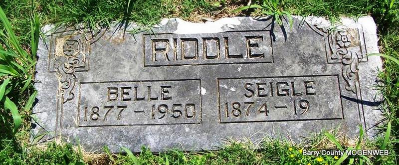 SSW: Belle - Research Note: Son of James Riddle and Mary Jane Badget. His wife was Susan Belle Patton. The death year is given as 19__ on his stone. The cause of death was terminal pulmonary edema. His father was given as James Riddle and his mother's name was unknown to the informant, Mrs. Rachel Barrett, Rt. 1, Webb City, MO. His marital state was widowed and his usual occupation was groceryman. His usual address was 424 S. Hall St., Webb City, Jasper Co., MO. Death Certificate #13743. - February 21, 1918, Thursday, Cassville Republican - Cross Hollows: Mrs. Phillip Riddle and son, Floyd, of Mineral Springs visited at Seigle Riddle's Thursday. - Seigle Riddle and daughters, Misses Rachel and Mary visited at Wesley Riddle's of Jenkins Monday. - Cassville Republican, Thursday, March 28, 1918 - Cross Hollows: Harrison Spain and wife visited their cousin, Seigle Riddle, and family Saturday night and Sunday. | Death Certificate Stan McKay Photo Don Warner - Deceased Father's Obit Online Newspapers Phyllis Long |