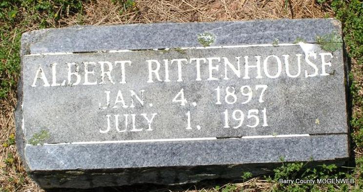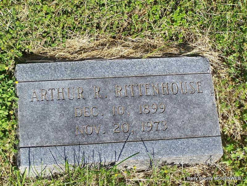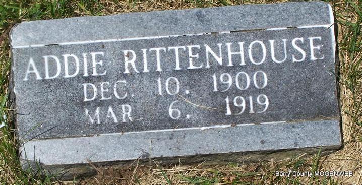 Research Note: Her death certificate reads that she was born Dec. 10, 1899 1900 as the stone reads. It reads that she died Mar. 8, 1919 and not the 6th as the stone reads. The cause of death was suicide. Her father was Henry A. Rittenhouse, born IN, and her mother was Etta Frail, born Lima, OH. Her father was the informant. - Cassville Republican, Thursday, March 13, 1919 - Miss Adeline Rittenhouse, daughter of Mr. and Mrs. H. A. Rittenhouse, east of Gunter Church, committed suicide Saturday evening at the Maxwell rooming house in Monett where she was working by drinking carbonic acid. She was 19 years old. Mrs. Rittenhouse and sons were on the home place northeast of Butterfield while Mr. Rittenhouse and two daughters were living at Monett. The father worked for the Frisco. In addition to keeping house for their father the girls were working during the day at domestic work. She lived only a short time after taking the acid. | Photo Don Warner - Deceased Death Certificate Donna Cooper Online Newspapers Phyllis Long |