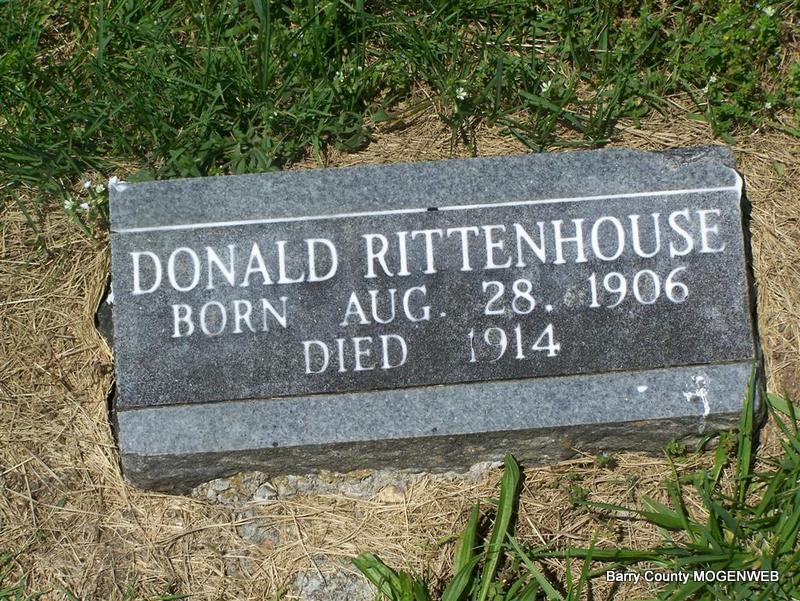 Research Note: His death certificate has his birth date Aug. 29, 1905 and not Aug. 28, 1906 as the stone reads. His father was Henry A. Rittenhouse, born Warren, IN, and his mother was Etta Frail, born Lima, OH. The cause of death was typhoid fever. H. A. Rittenhouse, Butterfield, MO. - May 7, 1914, Thursday, Cassville Republican - Donald Rittenhouse died Wednesday of last week, at the home of his parents, of typhoid, age 8 years. Interment was made Thursday at Sparks. | Photo Don Warner - Deceased Death Certificate Donna Cooper Online Newspapers Phyllis Long |