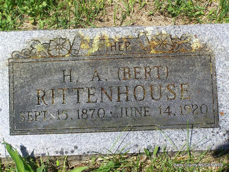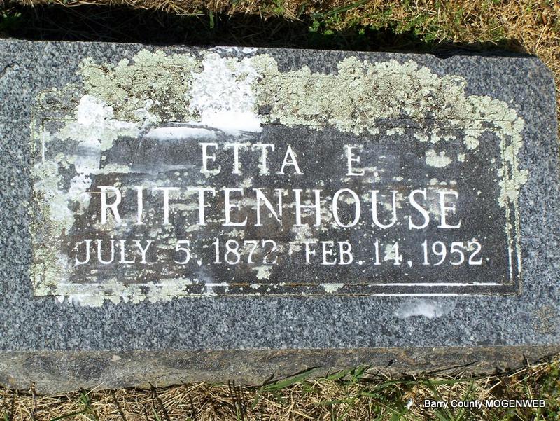 Inscription: "Father" - Research Note: His death certificate has his birth date Sept. 15, 1869 and not 1870 as the stone reads. He was age 50 years, 8 months and 29 days old when he died, which would make the 1869 date correct. He was a car inspector for the railroad. His father was Reason Rittenhouse, born IN, and his mother was Rebecca Follis, born IN. He was run over by cars and killed instantly. Mrs. H. R. Rittenhouse, Butterfield, MO, was the informant. His wife was Etta Frail. - Cassville Democrat, June 19, 1920 - H. A. Rittenhouse who lives near Butterfield and was working for the Frisco at Monett, as car inspector was killed about 11 o'clock Monday night. He was coupling cars at the time and was struck by cars that were being switched and died in a few minutes. His family lived on their farm near Butterfield. The remains were prepared for interment and shipped to Butterfield. - June 26, 1920, Cassville Democrat - H. A. Rittenhouse while employed as car inspector at the Frisco R. R. yards at Monett, Mo., while on duty was crushed between 2 cars at midnight Monday night, June 14. A leg being cut off and other injuries that caused his death in 15 minutes after the accident. He was 54 years of age. He was well respected and was of a very pleasant disposition. "In the midst of life there is death." The remains were interred at the Sparks Cemetery, June 17. Funeral service were ably conducted by Rev. F. M. Goodnight. We extend our sympathies to the bereaved family. Mrs. Rittenhouse's mother Mrs. Frail and daughters of Lima, Ohio, came on the 18th to be with her daughter. Rev. Rittenhouse of WV, a Presbyterian minister and another brother has been with the family. A sister of Mrs. Rittenhouse of Chicago, has been with her. | Photo Don Warner - Deceased Online Obit Phyllis Long |