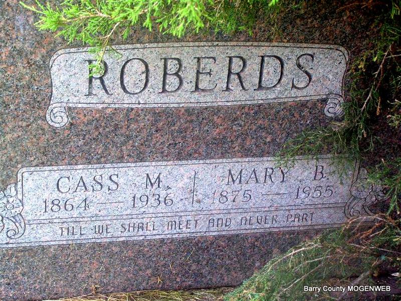 SSW: Mary B. - Research Note: His death certificate is indexed incorrectly by the SOS web site as Charles. It reads that his name was Cas M. Roberts and not Roberds as the stone reads. His father was James Roberts/Roberds, born MO, and his mother was Hanna Shipman, born MO. Mrs. M. B. Roberts, Purdy, MO, was the informant. - Cassville Democrat, November 27, 1909 - Circuit Court Proceedings: State vs. Cass M. Roberds, common assault; continued. - Cassville Republican, Nov. 19, 1936 - Cass M. Roberds, son of James and Hannah Roberds, was born Feb. 5, 1865, and departed this life at his home in Gunter community, Nov. 11, 1936, where he lived the past 37 years. On Dec. 8, 1889, he was united in marriage to Miss Mary A. Roberts. To this union six children were born, two having died in infancy. Four children, with his wife, are left to mourn his passing. They are: Mrs. Clifford Rouse of Cassville; Mrs. Elmo Campbell, of Pittsburg, KS; Aubrey and Bertalene at home. He is also survived by four brothers and four sisters. He was a good neighbor and friend. Funeral services were held at the Fairview church Sunday afternoon, conducted by T. L. Bennett, after which he was laid to rest in the Sparks cemetery. | Photo Don Warner - Deceased Death Certificate Donna Cooper Obit Phyllis Long |