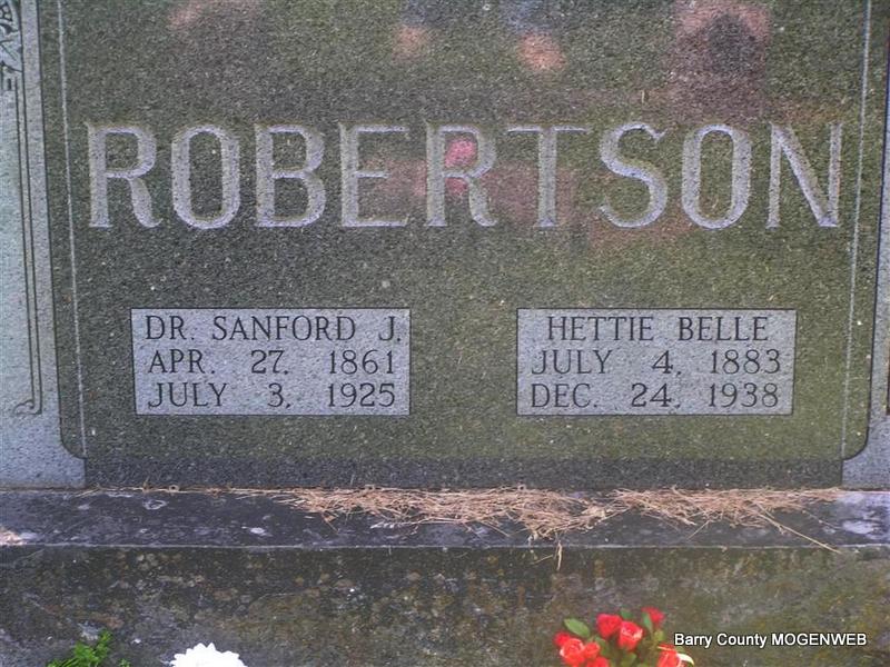 SSW: Hattie Belle - Research Note: His death certificate has his name as Sampson J. Robertson. He was married, a physician and his death certificate reads he was born Apr. 27, 1867 and not Apr. 27, 1861 as his stone reads. His father was Larkin Henry Robertson and his mother Mary Matilda Lillis. Mrs. S. J. Robertson, McDowell, MO, was the informant. - Mother's Obit | Death Certificate Donna Cooper Photo Don Warner - Deceased |
