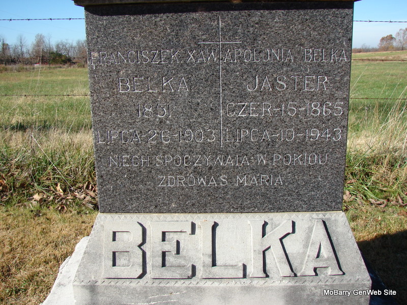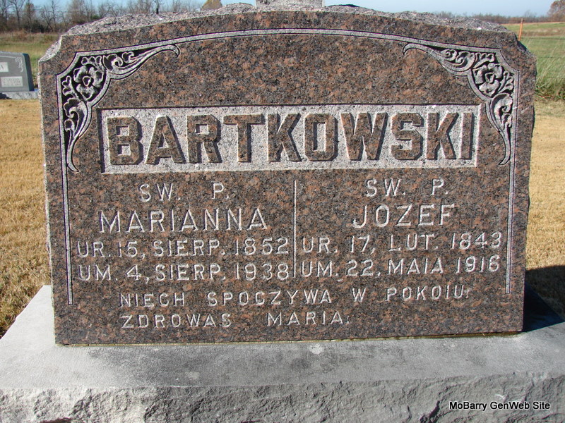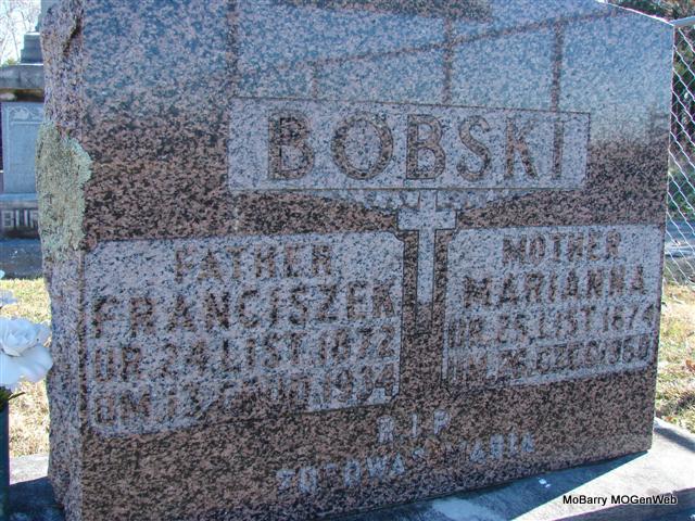 SSW: Franciszek - Research Note: The stone has information but is written in German. She was indexed as Mary on the death certificate site on Missouri Archives. Mary Bobski (Zerniski) and was born Nov. 25, 1874 born Poland and died June 26, 1950 in Pioneer Twp., Barry Co., MO. She had been widowed twice and was a daughter of John Zerniski. Her mother's maiden name was unknown. Her husband was Frank Bobski and Edward Bobski of Monett, MO was the informant. - Notes for Marianna Bobski | Death Certificate Census Notes Phyllis Long Dates from Book-Past & Present Frank Hatton Photo Jim Pierce |