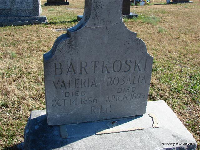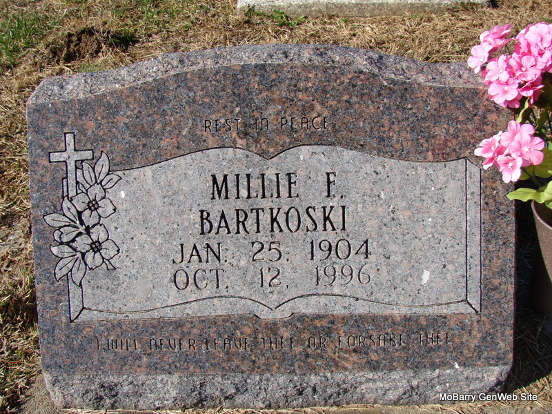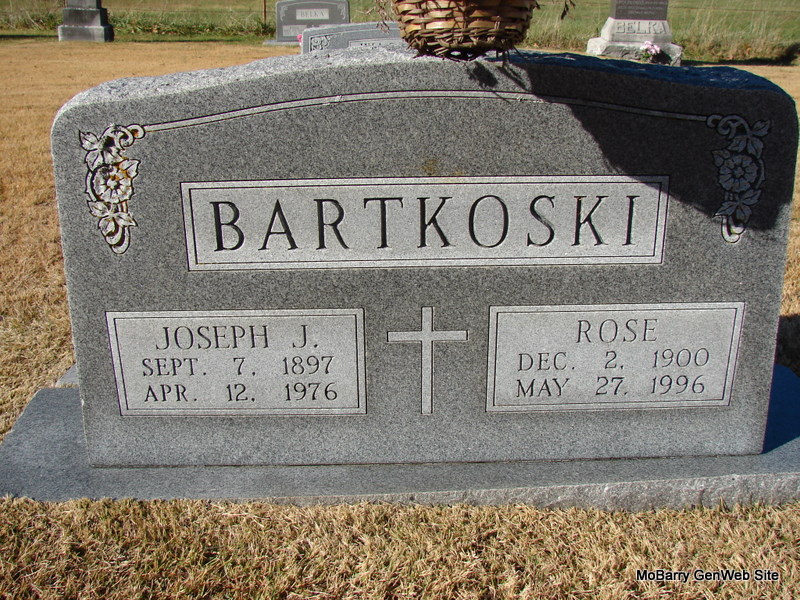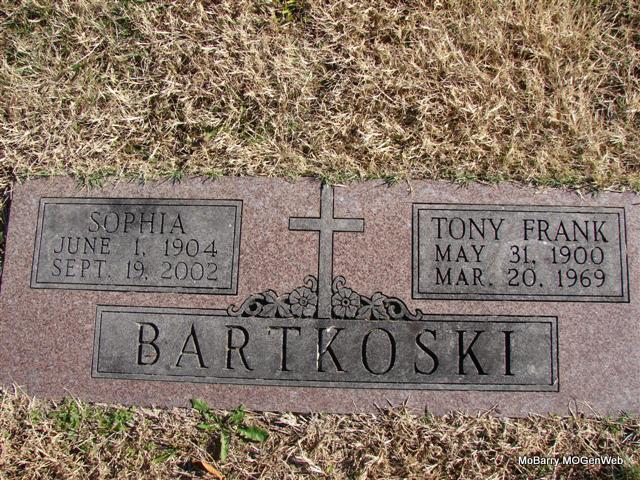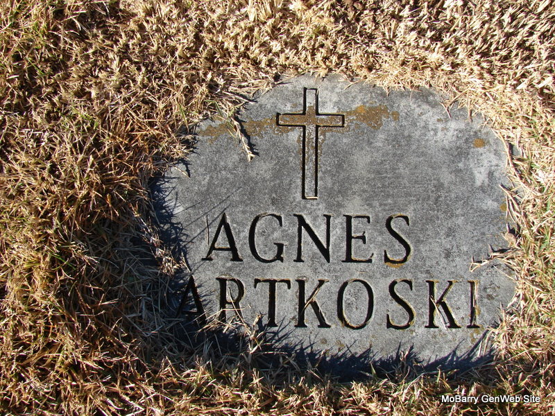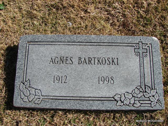 Research Note: Daughter of Barney Friday and Rose Ankewicz. Her husband was Clayton A. Bartkoski. He shares a stone with his brother Valentine. - 1930 Census Missouri; Barry; Capps Creek; District 3 - Barney Friday, head, age 56, married at age 24, born Poland, parents born Poland; Rosey, wife, age 49 married at age 18, born Poland, parents born Poland; Dorothy, dau., age 20, born MO; Agnes, dau., age 18, born MO; Raymond, son, age 16, born MO - SSDI - Name: Agnes Bartkoski - SSN: 488-24-3810 - Last Residence: 66061 Olathe, Johnson, Kansas - Born: 7 Jul 1912 - Died: 30 Apr 1998 - State (Year) SSN issued: Missouri (Before 1951) | SSDI Census Phyllis Long Dates from Book-Past & Present Frank Hatton Photo Jim Pierce |